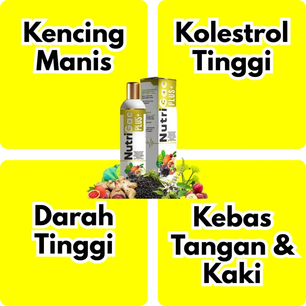 NutriGAC Plus+ Dirumus dengan 10 ramuan premium herba semula jadi yang berkhasiat sebagai jus kesihatan yang diformulasikan untuk membantu masalah